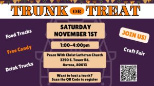 You’re invited to Peace With Christ’s annual Trunk or Treat family event on Saturday, November 1st, from 1-4 PM. This is a free community event, and we can’t wait to see you there!