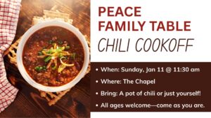 Join us Sunday, January 11th at 11:30am in the chapel for an afternoon of friendship and great food! Bring your favorite pot of chili—or just bring yourself—and gather around the table with your Peace family. This is a come-as-you-are, all-ages event. Let’s eat, connect, and enjoy being together. No registration needed!